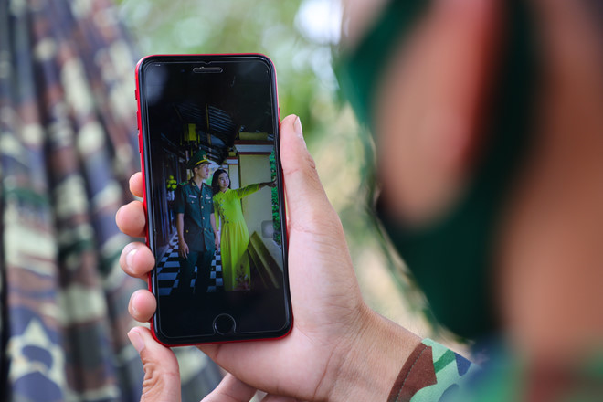 Trung úy Huỳnh Văn Kiệt lưu trên điện thoại hình chụp cùng người yêu/Ảnh: Ngô Trần Hải An