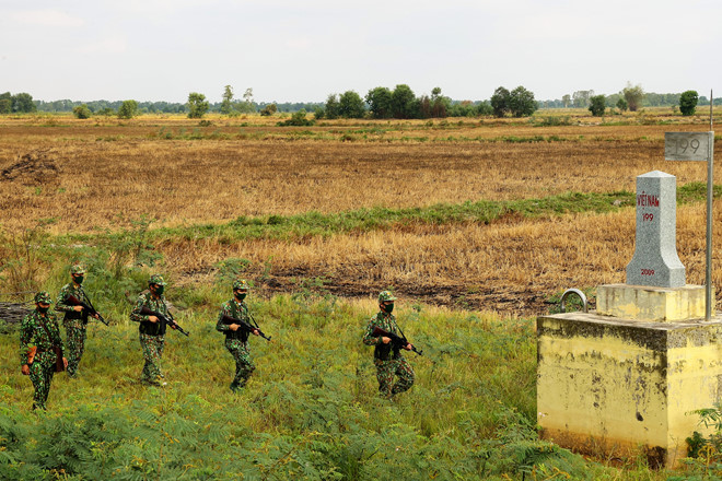 Bộ đội biên phòng đồn Bình Thạnh (Long An) tuần tra kiểm soát dọc đường biên giới VN - Campuchia/Ảnh: Ngô Trần Hải An