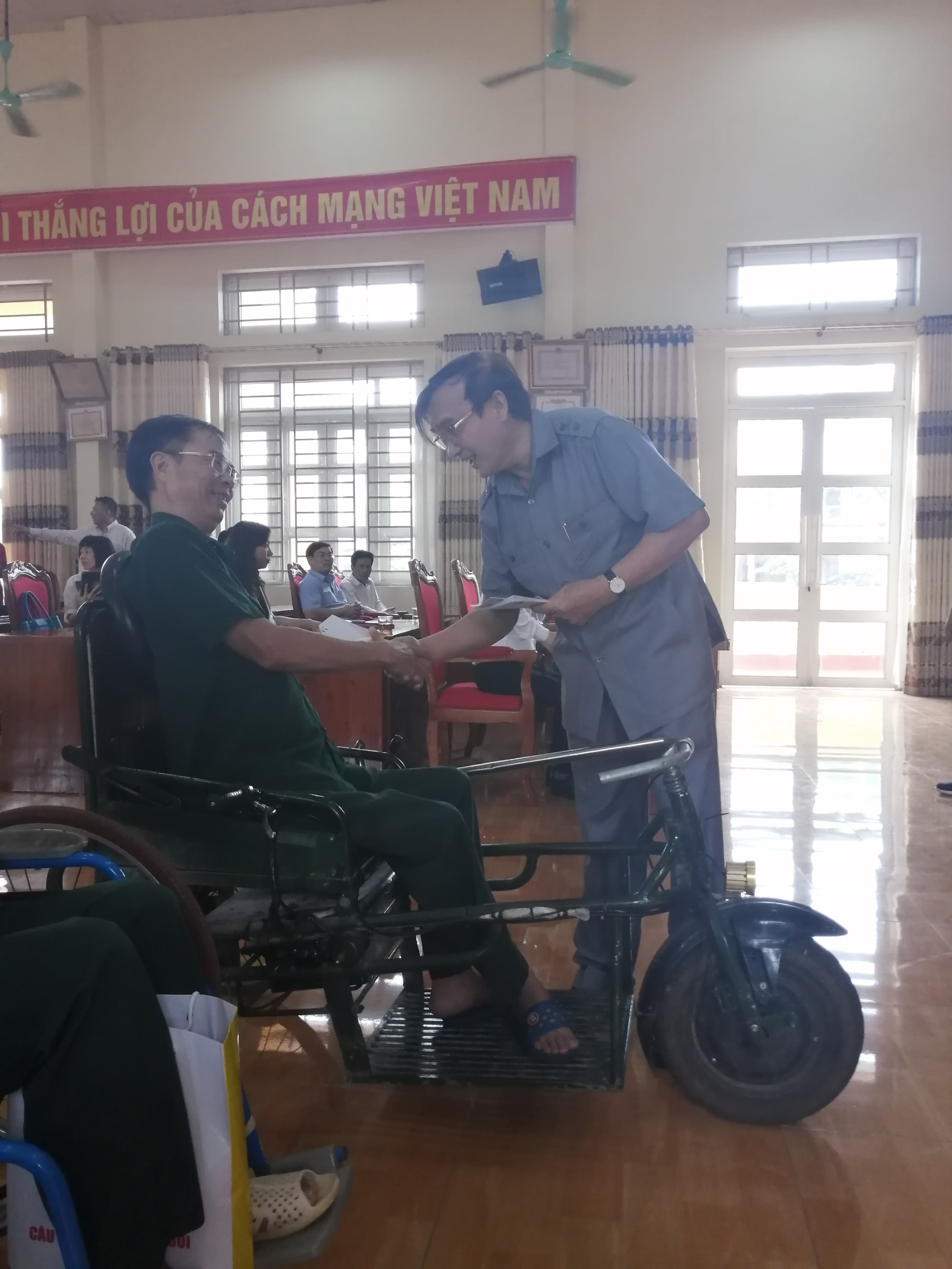 Đoàn đại biểu với sự tham gia của Anh hùng LLVTND, Thiếu tướng Lê Mã Lương - Chủ tịch Hiệp hội VAIDE; Ông Nguyễn Xuân Định - Phó Chủ tịch hội Nông dân Việt Nam; Ông Hồ Đại Dũng - Phó Chủ tịch UBND tỉnh Phú Thọ; ông Nguyễn Ngọc Quyết - Tổng biên tập Tạp chí điện tử Hoà nhập; bà Nguyễn Thị Kim Oanh - Giám đốc Công ty TNHH Thương mại sản xuất dệt may và du lịch Bình Anh; MC Thảo Vân cùng các nhà hảo tâm.