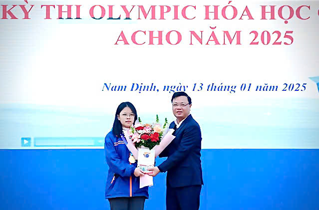 Bí thư Đảng ủy, Hiệu trưởng Phạm Thanh Ngọc tặng hoa, trao thưởng, chúc mừng học sinh Phan Bảo Ngọc (lớp 11 chuyên Hóa Trường THPT chuyên Lê Hồng Phong tỉnh Ninh Bình) xuất sắc đạt Huy chương Vàng tại kỳ thi Olympic Hóa học Châu Á ACHO 2025 - Ảnh: Cơ sở cung cấp