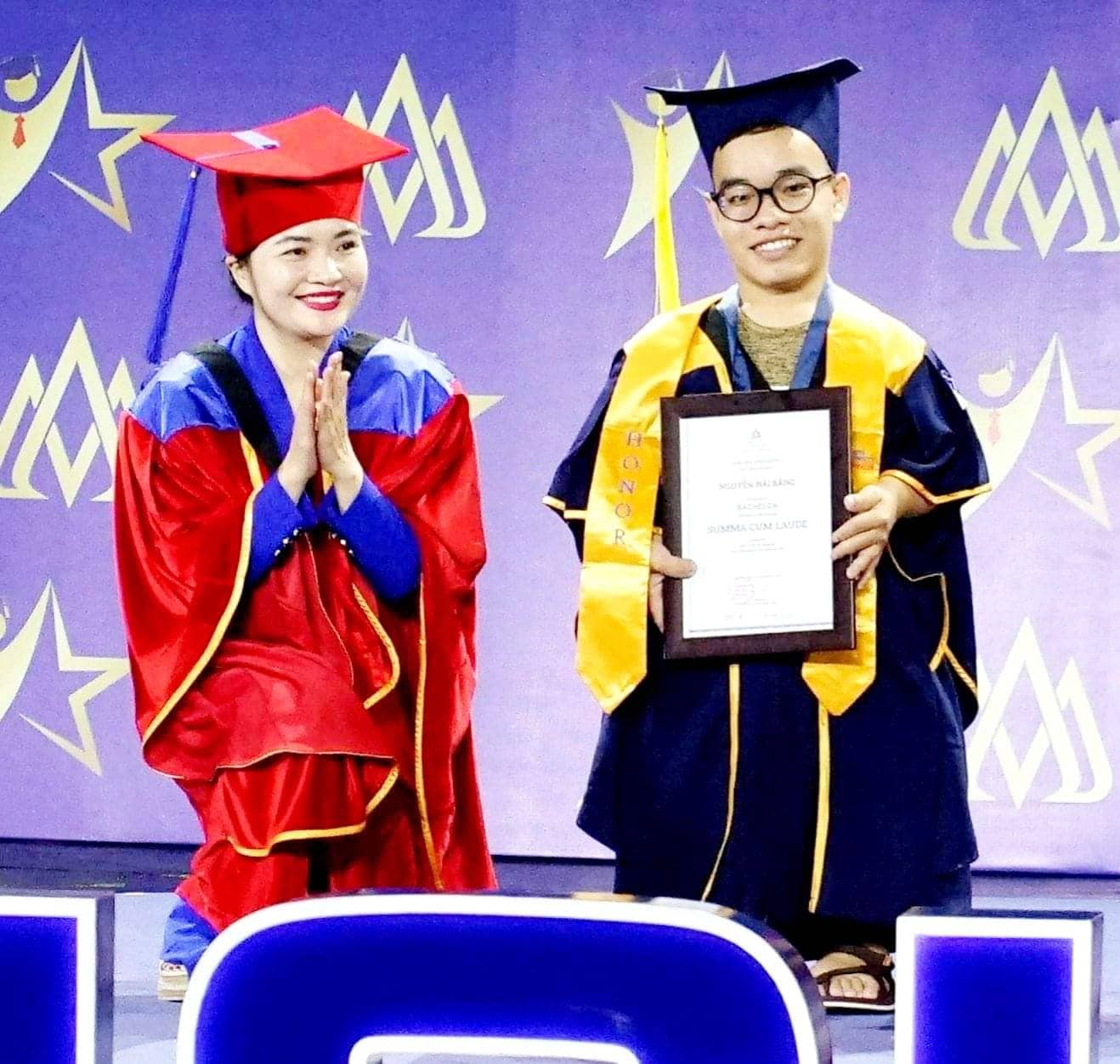 Nguyễn Hải Bằng được Hiệu trưởng trường ĐH Hoa Sen trao bằng và huy chương cho sinh viên suất sắc. Ảnh: Internet