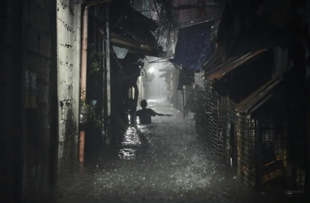 Một người đàn ông lội qua vùng nước ngập sâu đến thắt lưng tại một khu dân cư sau khi Bão nhiệt đới Wipha gây ra mưa gió mùa dữ dội dẫn đến lũ lụt ở thành phố Quezon, Philippines, vào thứ Hai, ngày 21 tháng 7 năm 2025. (Ảnh AP/Aaron Favila)