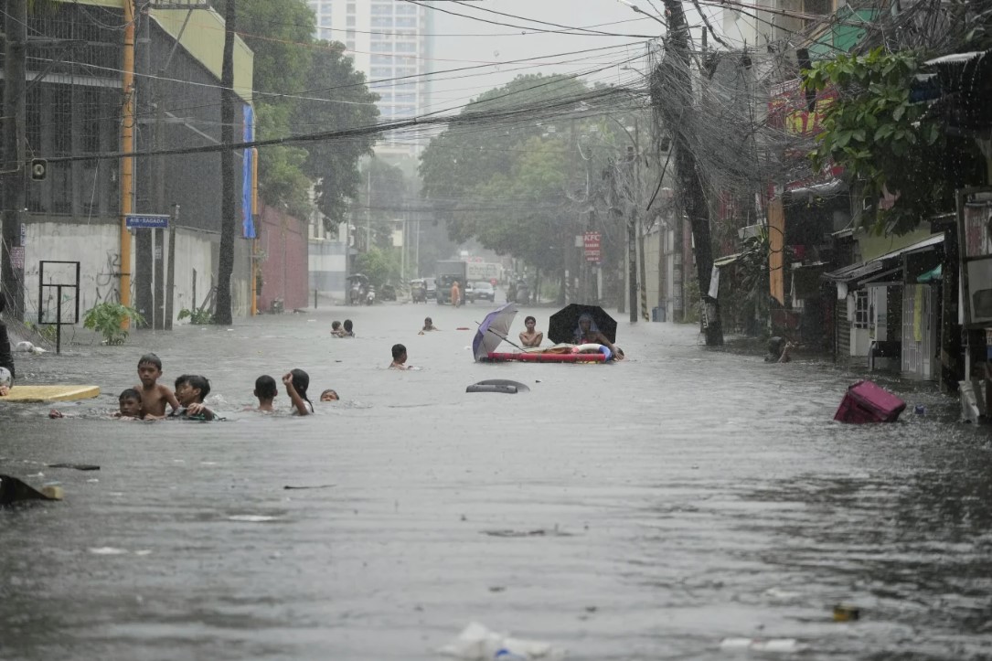 Trẻ em bơi dọc theo lũ lụt tại một khu dân cư sau khi Bão nhiệt đới Wipha gây ra mưa gió mùa dữ dội ở thành phố Quezon, Philippines, vào thứ Hai, ngày 21 tháng 7 năm 2025. (Ảnh AP/Aaron Favila)
