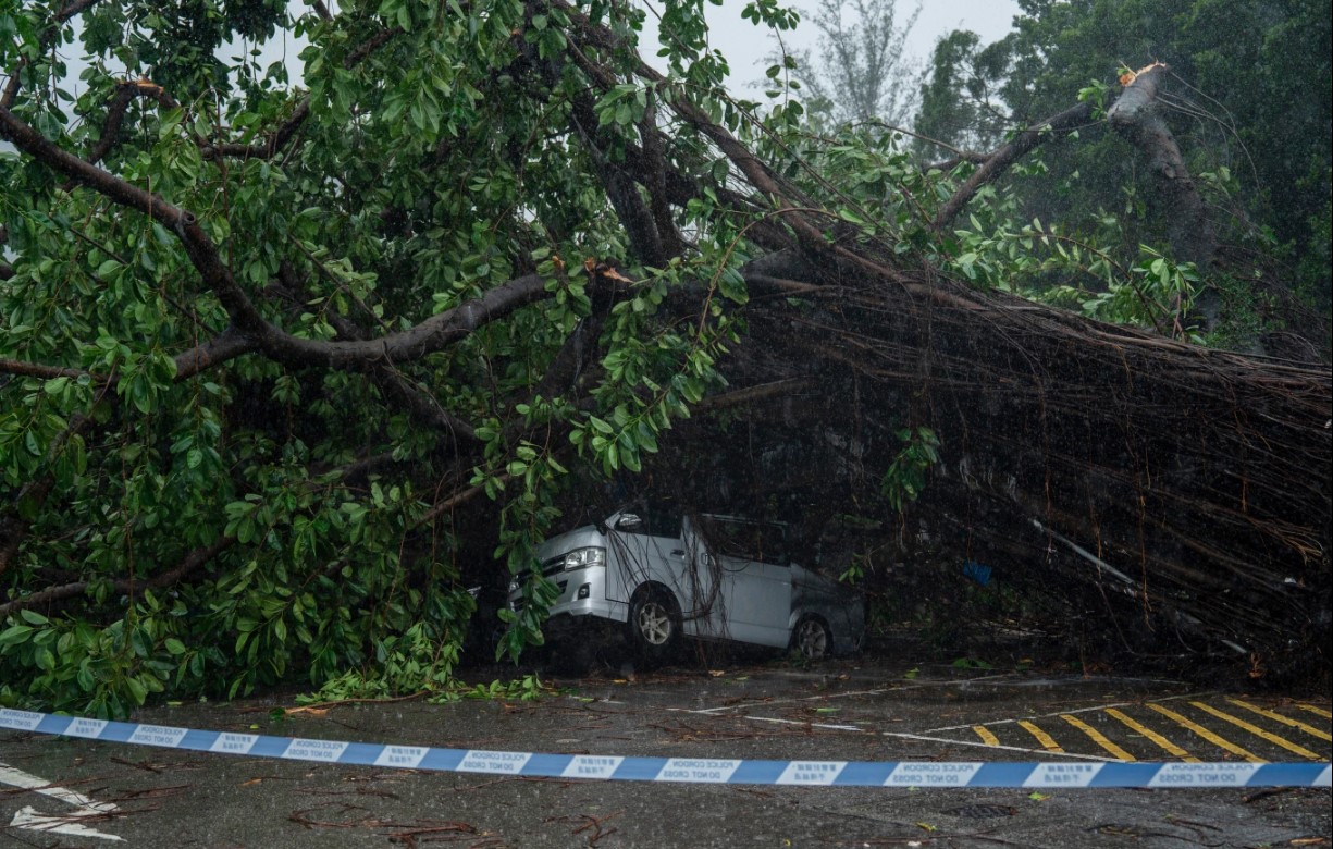 Một chiếc xe bị hư hại do cây đổ sau cơn bão Wipha, tại Hồng Kông, Chủ Nhật, ngày 20 tháng 7 năm 2025. (Ảnh AP/Vernon Yuen)