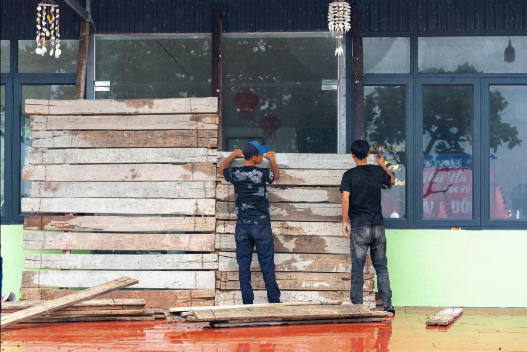 Người dân gia cố cửa trước cơn bão Wipha tại Hải Phòng, Việt Nam vào thứ Hai, ngày 21 tháng 7 năm 2025. (Le Tan/VNExpress)