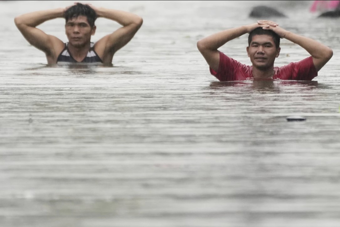 Người dân lội qua lũ lụt ngập đến cổ sau khi Bão nhiệt đới Wipha gây ra mưa gió mùa dữ dội ở thành phố Quezon, Philippines, vào thứ Hai, ngày 21 tháng 7 năm 2025. (Ảnh AP/Aaron Favila)