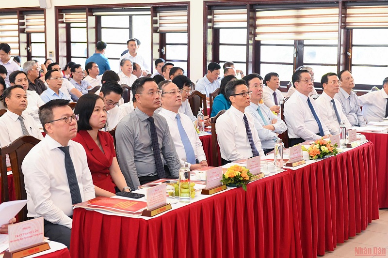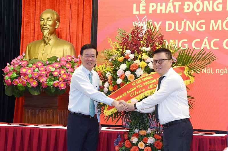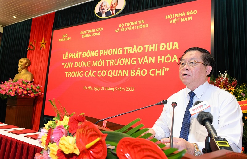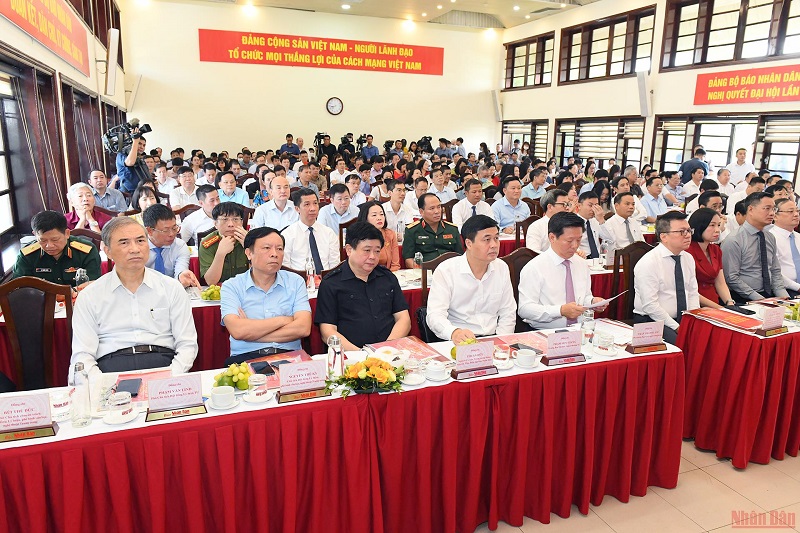 Tới dự lễ phát động có các đồng chí: Võ Văn Thưởng, Ủy viên Bộ Chính trị, Thường trực Ban Bí thư; Nguyễn Trọng Nghĩa, Bí thư Trung ương Đảng, Trưởng Ban Tuyên giáo Trung ương; Vũ Đức Đam, Ủy viên Trung ương Đảng, Phó Thủ tướng Chính phủ; Lê Quốc Minh, Tổng Biên tập Báo Nhân Dân, Phó Trưởng Ban Tuyên giáo Trung ương, Chủ tịch Hội Nhà báo Việt Nam; Nguyễn Mạnh Hùng, Phó Trưởng Ban Tuyên giáo Trung ương, Bộ trưởng Thông tin và Truyền thông; Đỗ Tiến Sỹ, Tổng Giám đốc Đài Tiếng nói Việt Nam; Lê Ngọc Quang, Tổng Giám đốc Đài Truyền hình Việt Nam; Vũ Việt Trang, Tổng Giám đốc Thông tấn xã Việt Nam.(Ảnh: THÀNH ĐẠT)