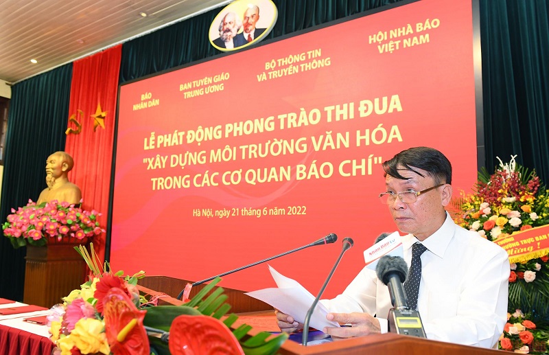 Đồng chí Nguyễn Đức Lợi, Phó Chủ tịch Thường trực Hội Nhà báo Việt Nam phát biểu phát động phong trào thi đua. (Ảnh: THÀNH ĐẠT)