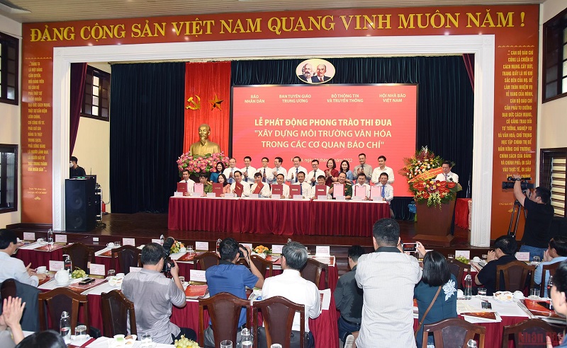 Lễ ký kết giao ước thực hiện phong trào thi đua “Xây dựng môi trường văn hóa trong các cơ quan báo chí”. (Ảnh: TRẦN HẢI)
