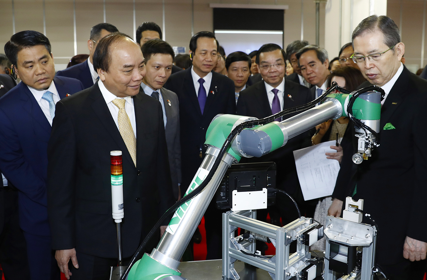 | Thủ tướng nghe nhân viên Tập đoàn giới thiệu máy lắp ráp tự động. Ảnh: VGP/Quang Hiếu |