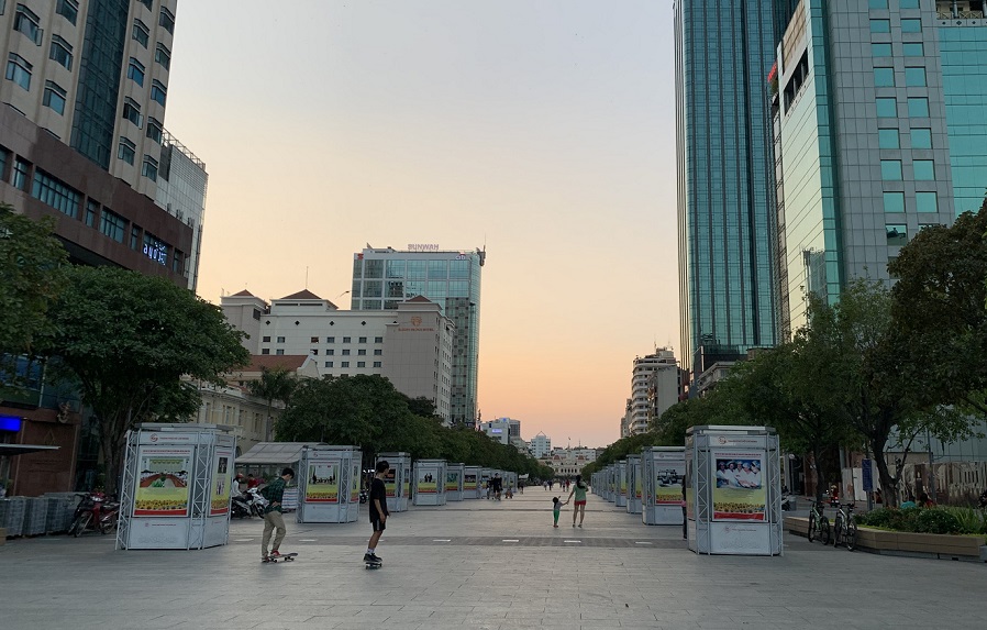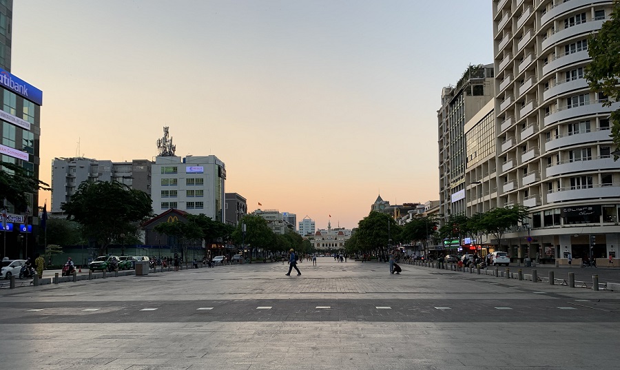 Phố đi bộ Nguyễn Huệ (Quận 1, TP.HCM) ít tụ tập đông người hơn trước, sau khi có khuyến cáo từ UBND TP.HCM.