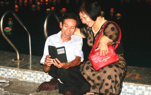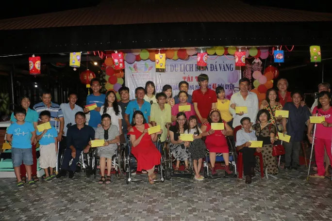 Sau khi đoàn khách nhận xong phòng nghỉ, có người tranh thủ ra ngắm biển hoặc chuẩn bị cho buổi tối gặp mặt giao lưu. Một chị mặc chiếc đầm đỏ rất đẹp nhưng đi lại khó khăn trên đôi nạng. Người chồng cũng thế. Họ từ TP HCM ra. Anh là Nguyễn Hoàng Lâm (ngụ quận 3) và chị là Lê Thị Mỹ Phượng (ngụ quận 12).