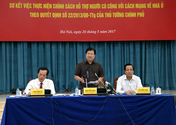 Phát biểu chỉ đạo Hội nghị, Phó Thủ tướng Chính phủ Trịnh Đình Dũng đánh giá cao những kết quả đạt được trong việc Thực hiện Nghị quyết số 494/NQ-UBTVQH13 của Ủy ban Thường vụ Quốc hội và Quyết định số 22/2013/QÐ-TTg của Thủ tướng Chính phủ về hỗ trợ NCC với cách mạng về nhà ở của các địa phương.