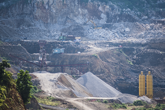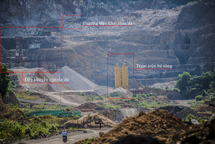 | Hình ảnh máy xúc, phương tiện vận chuyển và các đống đá đã được khai thác. |