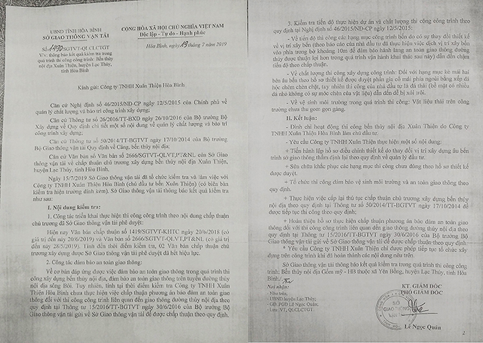 Thông tin từ Sở GTVT Hòa Bình cho biết, ngày 15/7 /2019 cơ quan này đã tổ chức kiểm tra và làm việc với Công ty TNHH Xuân Thiện Hòa bình, về tiến độ triển khai thi công công trình và công tác đảm bảo an toàn giao thông đường thủy tại vị trí bến thủy nội địa Xuân Thiện, xã Yên Đồng, Huyện Lạc Thủy. Tính đến thời điểm kiểm tra các văn bản có tính pháp lý được sở GTVT Hòa Bình phê duyệt đã hết hiệu lực. Trong đó văn bản chấp thuận chủ trương xây dựng bến thủy nội địa đã hết hiệu lực từ ngày 28/05/2019. Đồng nghĩa với việc Công ty Xuân Thiện đã xây dựng trái với chủ trương đã được Sở GTVT Hòa Bình phê duyệt.