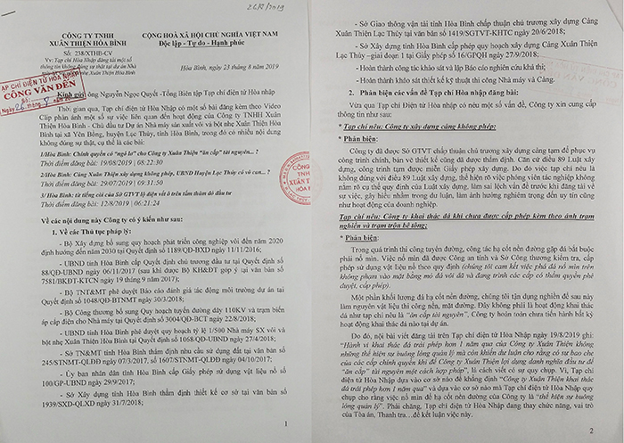 Vừa qua Ông Nguyễn Huy Hoàng - Tổng Giám đốc Công ty TNHH Xuân Thiện Hòa Bình đã có văn bản số: 238/XTHB-CV ngày 23/08/2019 phản biện về việc Tạp chí điện tử Hòa Nhập đăng tải một số thông tin không đúng sự thật tại Dự án nhà máy sản xuất vôi và bột nhẹ Xuân Thiện Hòa Bình. Ngoài việc viện dẫn một số văn bản pháp lý đã được các cơ quan có thẩm quyền phê duyệt, chấp thuận, công văn có một số nội dung phản biện các vấn đề đã được Tạp chí Hòa Nhập phản ánh như Công ty xây dựng cảng không phép. Về vấn đề này Công ty Xuân Thiện phản biện “Công ty đã được Sở GTVT chấp thuận chủ trương xây dựng cảng tạm để phục vụ công trình, bản vẽ thiết kế cũng đã được thẩm định. Căn cứ điều 89 Luật xây dựng, công trình tạm được miễn giấy phép xây dựng. Do đó việc tạp chí nêu là không đúng với điều 89 Luật xây dựng, thể hiện rõ việc phóng viên tác nghiệp không nắm rõ cụ thể quy định của Luật xây dựng, làm lệch vấn đề trước khi đăng tải về sự việc, gây hiểu nhầm trong dư luận, làm ảnh hưởng đến uy tín cũng như hoạt động của doanh nghiệp”.