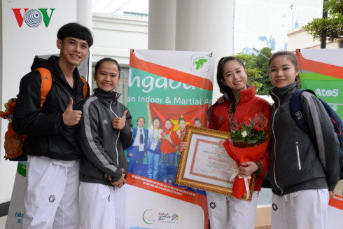 | Châu Tuyết Vân rạng rỡ bên cạnh các đồng đội (Ảnh: Hà Khánh). |