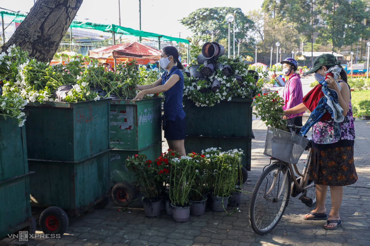 Các chủ hàng đồng loạt giảm giá "xả hàng" để về quê ăn Tết. Xe máy, ba gác, xe tải... vào tận trong công viên mua bán, chở hoa về cho khách.