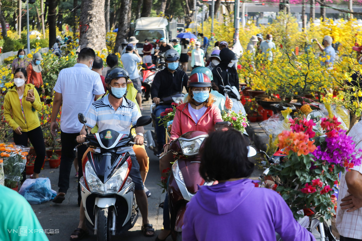 Ngày 29 Tết, các chợ hoa xuân tại TP HCM phải đóng cửa để trả mặt bằng. Tại chợ hoa ở công viên Gia Định sáng nay nhộn nhịp mua bán. Hai bên đường Hoàng Minh Giám tấp nập người dân đến mua hoa trước thời điểm Giao thừa.