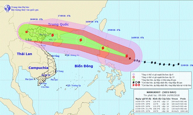 Dự báo siêu bão Mangkhut di chuyển theo hướng Tây Tây Bắc, mỗi giờ đi được khoảng 25km. Đến 4 giờ ngày 16/9, vị trí tâm bão ở khoảng 20,1 độ Vĩ Bắc; 116,1 độ Kinh Đông, cách đảo bán đảo Lôi Châu (Trung Quốc) khoảng 610km về phía Đông Đông Nam.