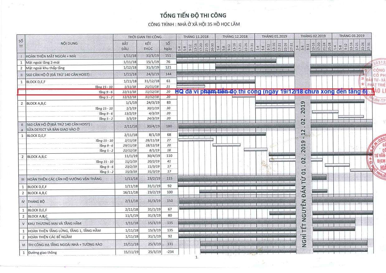 Yêu cầu này của CĐT được thực hiện song song với điều kiện mà cư dân đưa ra: “HOF và Công ty Hoàng Quân phải thi công đúng bản tiến độ mà HOF và Hoàng Quân cung cấp ngày 1/11/2018 cho khách hàng”.