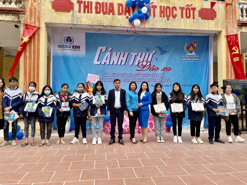 Bí thư Huyện đoàn, bí thư Xã đoàn cùng GĐ Hệ thống Anh ngữ Quốc tế Ocean edu Văn Giang lên trao học bổng chứng nhận cho các em học sinh đoạt giải.
