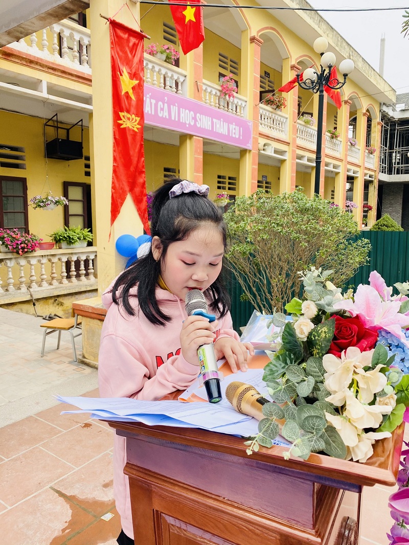 Học sinh Ngô Phương Anh lớp 6A trường THCS Phụng Công lên đọc bức thư hay nhất gửi tặng các chiến sĩ Hải quân.
