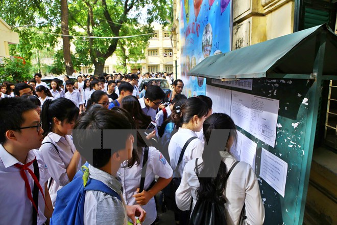 | Thí sinh xem số báo danh và phòng thi tại điểm thi trường Trung học phổ thông Việt Đức. (Ảnh: Minh Quyết/TTXVN) |
