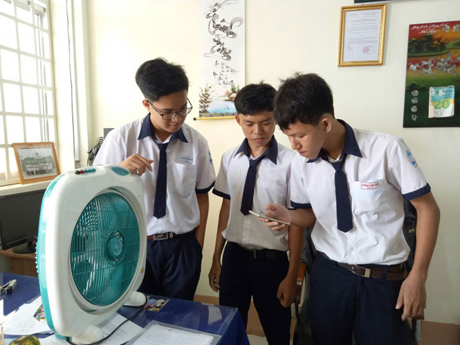 | Nhân, Tài, Thông đang thao tác điều khiển quạt bằng giọng nói thông qua phần mềm trên điện thoại. DUY TÂN |