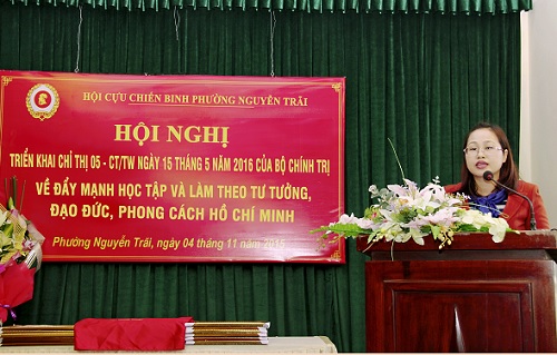 | Đồng chí Nguyễn Thúy Hằng - Quận ủy viên, Bí thư Đảng ủy phường trực tiếp triển khai Chỉ thị 05 CT/TW ngày 15/5/2016 về đẩy mạnh học tập và làm theo tư tưởng, đạo đức, phong cách Hồ Chí Minh cho đội ngũ cán bộ CCB phường |