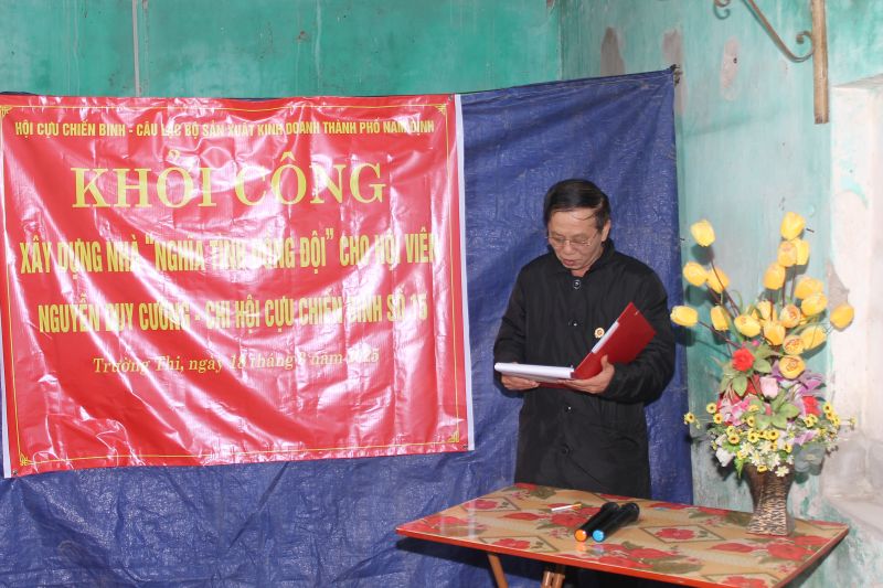 Sáng 18-3-2025, tại số nhà B11-P14 Tập thể Văn Miếu, Tổ dân phố số 15, phường Trường Thi, thành phố Nam Định, tỉnh Nam Định, Hội CCB phường Trường Thi, Hội CCB thành phố Nam Định đã long trọng tổ chức lễ khởi công xây dựng nhà “Nghĩa tình đồng đội” cho hội viên CCB Nguyễn Duy Cường. Dự lễ khởi công có các đồng chí: Đại tá Lê Xuân Thu, Phó Chủ tịch Thường trực Hội CCB tỉnh Nam Định, Đại tá Mai Văn Quyền, Chủ tịch Hội CCB thành phố Nam Định; đại diện CLB Sản xuất kinh doanh Hội CCB thành phố Nam Định; đại diện lãnh đạo Đảng ủy, UBND, Ủy ban MTTQ, Thường trực Hội CCB phường Trường Thi, các ban, ngành, đoàn thể phường Trường Thi; đại diện chi ủy, chi bộ, chính quyền, các tổ chức chính trị xã hội Tổ dân phố số 15, phường Trường Thi, thành phố Nam Định.
