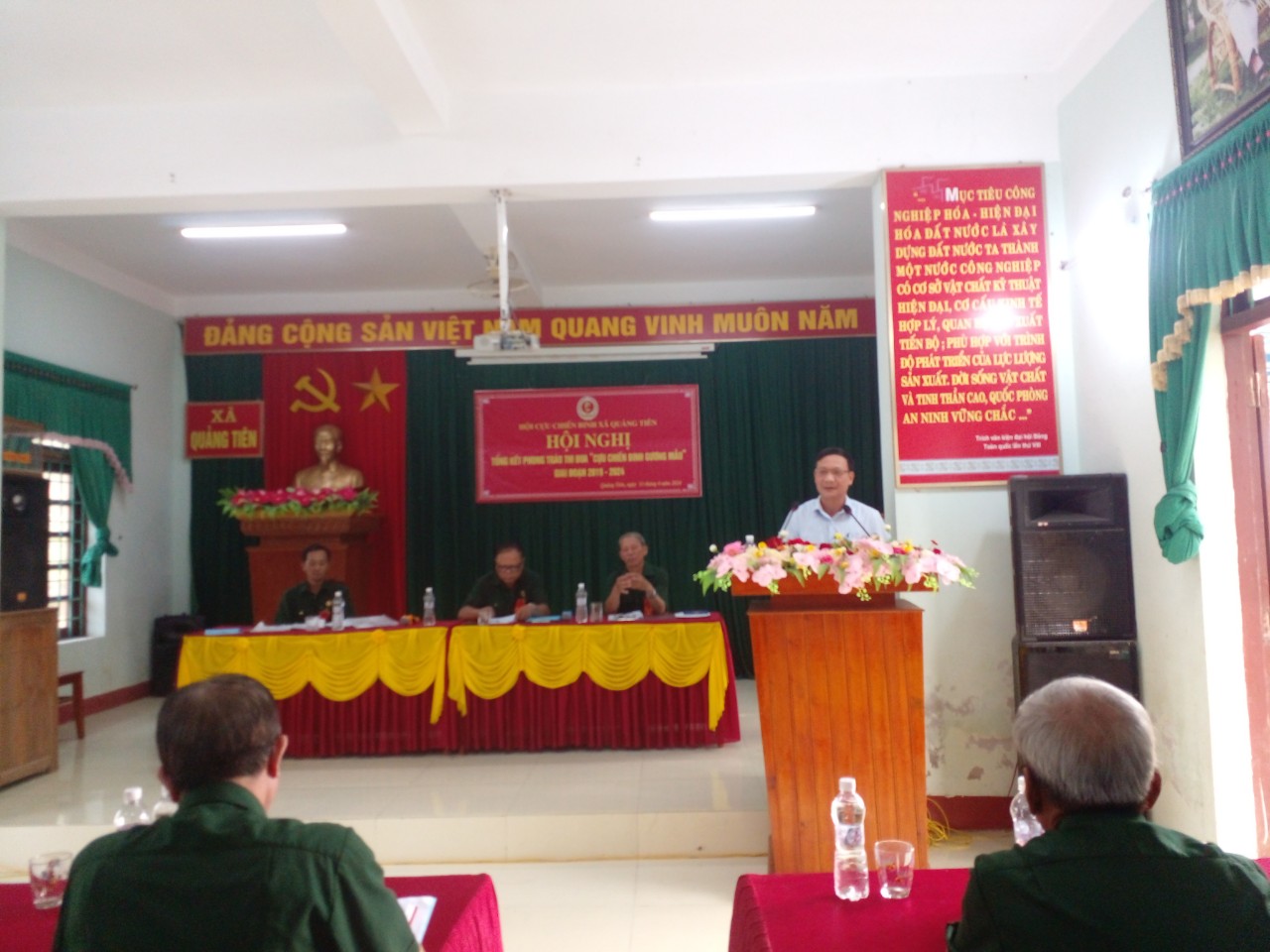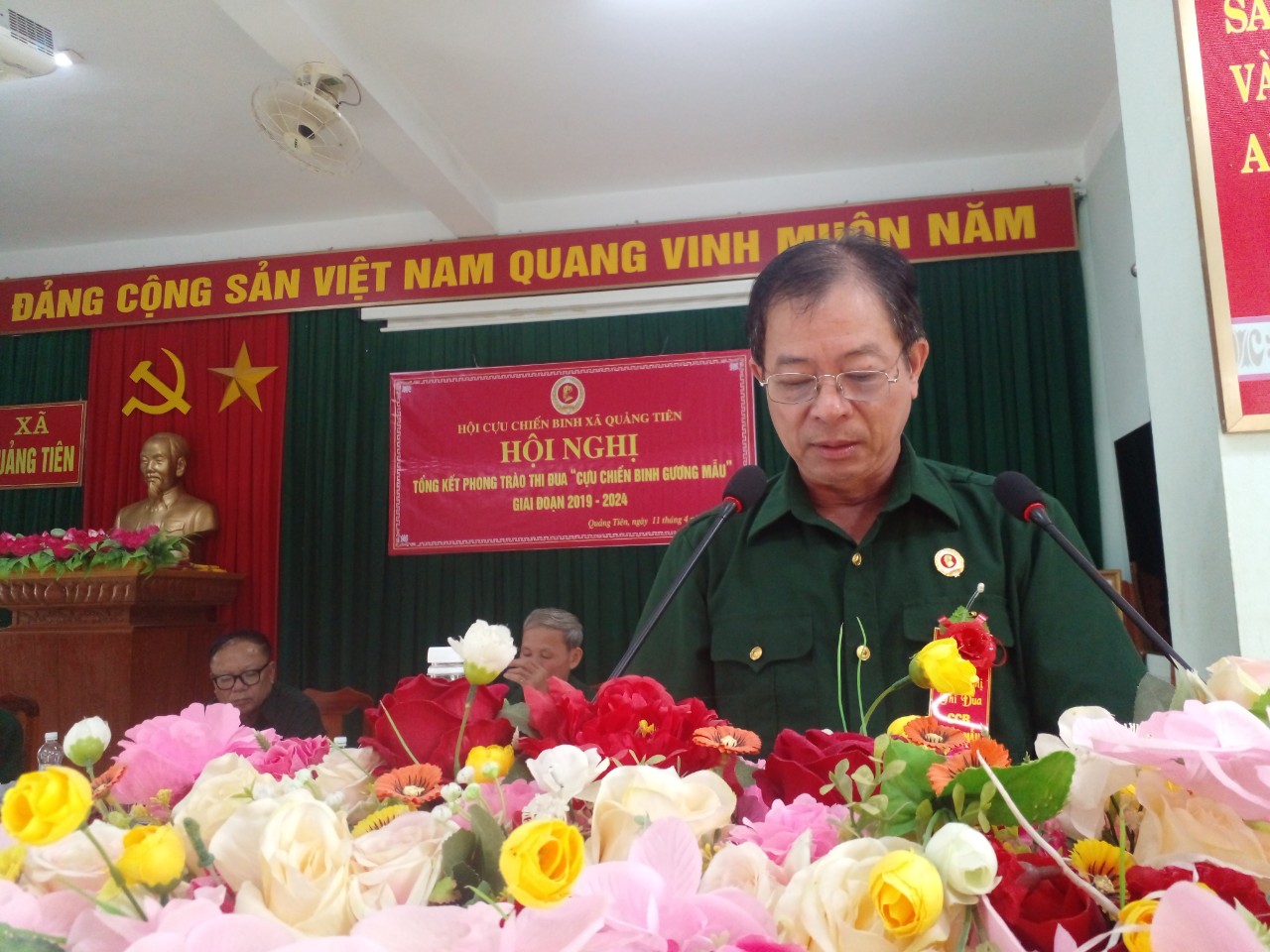 Ông Trần Văn Toàn - Chủ tịch Hội CCB thị xã Ba Đồn phát biểu tại hội nghị: “Đánh giá cao những kết quả hội cựu chiến binh xã Quảng Tiên đã đạt được trong phong trào “Cựu chiến binh gương mẫu” giai đoạn 2019 – 2024.Trong thời gian tới hội cựu chiến binh xã Quảng Tiên thực hiện một số nhiệm vụ đó là tiếp tục đẩy mạnh phong trào thi đua “Cựu chiến binh gương mẫu”, phần cùng Đảng bộ, chính quyền, nhân dân xã Quảng Tiên phấn đấu đạt xã nông thôn mới nâng cao vào năm 2025. Tích cực xây dựng mô hình điển hình tiên tiến trên các lĩnh vực công tác hội và các phong trào ở địa phương. Thường xuyên kiểm tra, đôn đốc, biểu dương khen thưởng kịp thời những tập thể, cá nhân đạt thành tích xuất sắc trong phong trào thi đua “CCB gương mẫu” giai đoạn 2024 – 2029. Hy vọng, với sự quyết tâm cao của hội cựu chiến binh xã Quảng Tiên trong thời gian tới, hội sẽ hoàn thành các nhiệm vụ đề ra, tiếp tục phát huy bản chất tốt đẹp của “Bộ đội Cụ Hồ” góp phần xây dựng địa phương ngày càng giàu mạnh”.