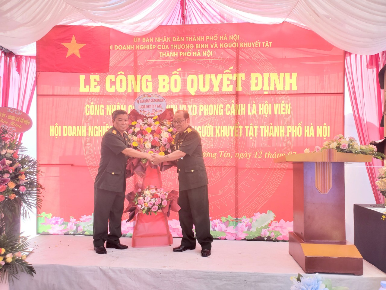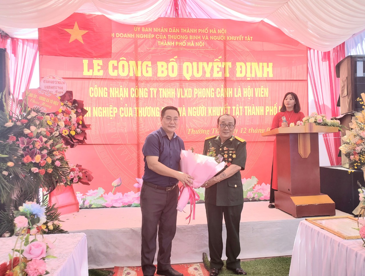 Ông Dương Minh Đỗ thay mặt Hội DN của thương binh và NKT thành phố Hà Nội tặng hoa chúc mừng Công ty Phong Cảnh