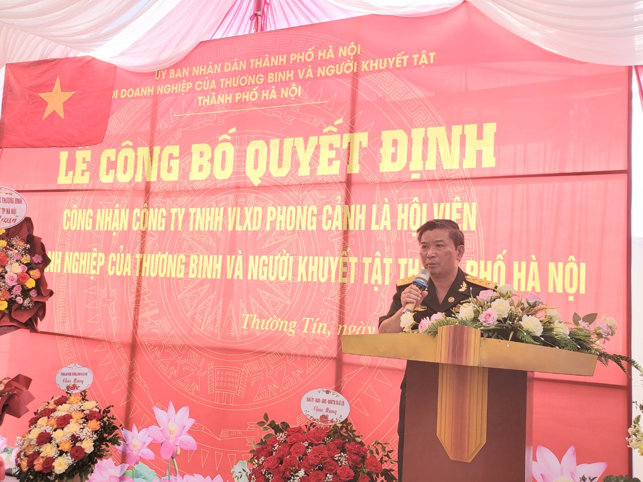 Phát biểu tại buổi Lễ, ông Dương Minh Đỗ - Chủ tịch hội DN của thương binh và NKT thành phố Hà Nội đã đánh giá cao sự nỗ lực vươn lên của các cán bộ, người lao động của Công ty Phong Cảnh. Phó chủ tịch mong rằng các đồng chí thương binh, con em gia đình chính sách đang làm việc tại doanh nghiệp sẽ nỗ lực hơn nữa phát huy phẩm chất Anh bộ đội Cụ Hồ, anh dũng trong chiến đấu, tích cực lao động sản xuất khi rời quân ngũ, tham gia tích cực vào xây dựng đời sống văn hóa tại địa phương. Đề nghị công ty sau khi trở thành hội viên Hội Hà Nội phải tích cực hoạt động đảm bảo tốt an sinh xã hội và tạo việc làm ổn định cho các đối tượng chính sách và người lao động, gắn bó mật thiết với Hội cũng như các đơn vị là doanh nghiệp hội viên để Hội ngày càng phát triển lớn mạnh.