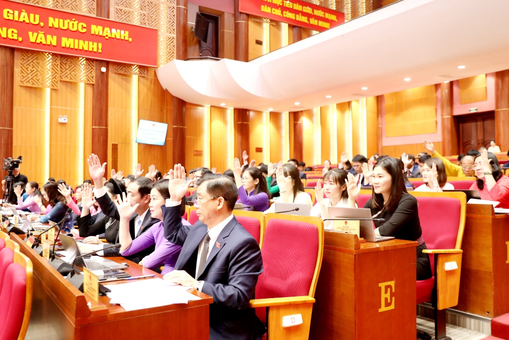 Đại biểu HĐND tỉnh biểu quyết thông qua các Nghị quyết tại kỳ họp.