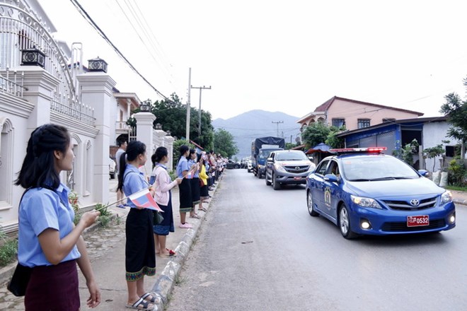 | Rất đông cán bộ công chức, lực lượng vũ trang và nhân dân các tầng lớp của tỉnh Oudomsay đứng dọc theo tuyến đường đoàn xe đi qua để chào tiễn các “anh” về với đất Mẹ. (Ảnh: Phạm Kiên/TTXVN) |