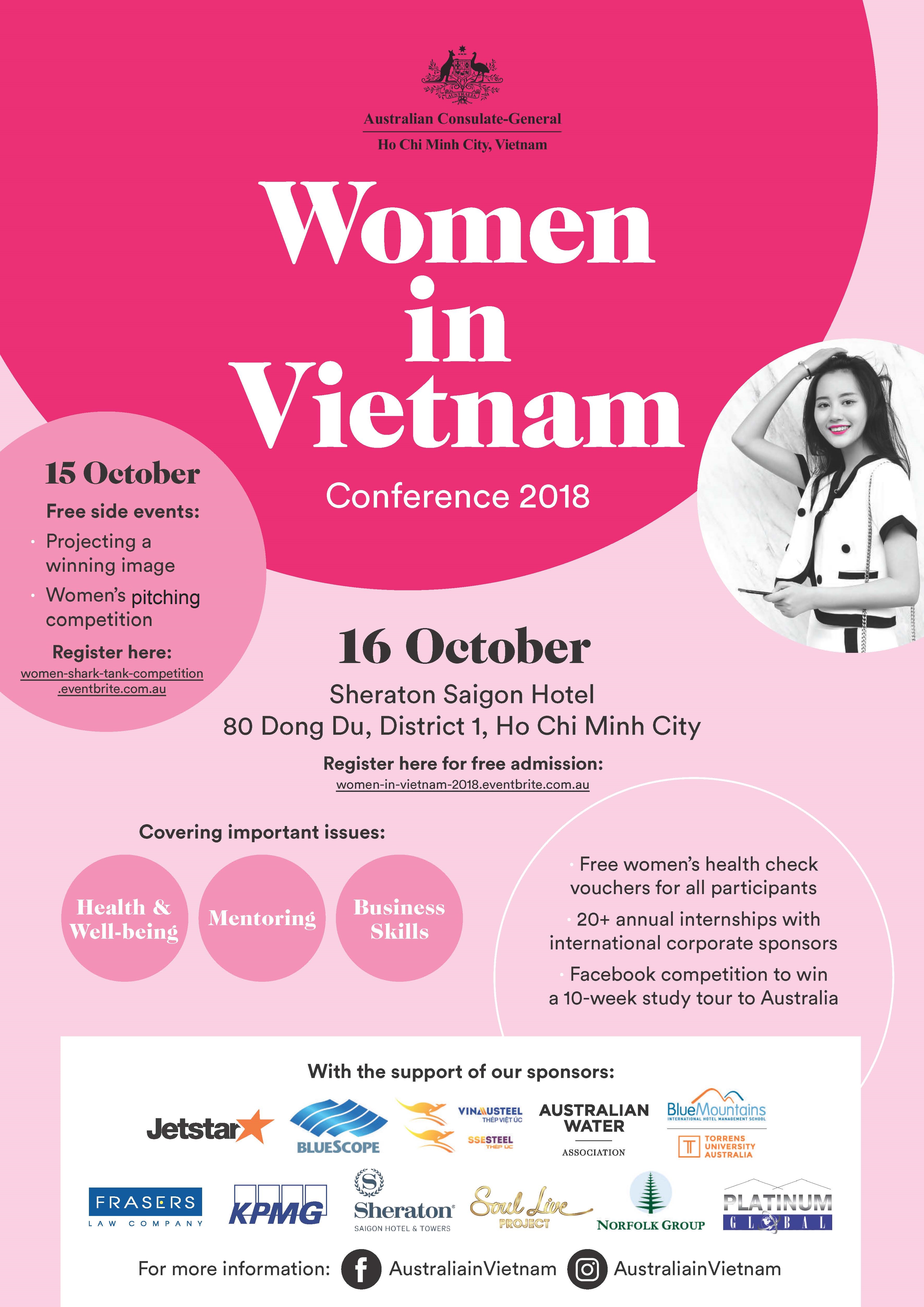 Tất cả những người tham gia tại Hội nghị chính sẽ nhận được phiếu kiểm tra sức khỏe của phụ nữ miễn phí, do Tổng lãnh sự quán Australia và Marie Stopes Việt Nam tặng. Hội nghị cũng sẽ ra mắt một cuộc thi với cơ hội giành được một suất học bổng tiếng Anh 10 tuần tại Australia, cũng như chương trình thực tập dành cho phụ nữ nhằm giúp các sinh viên nữ trẻ vừa tốt nghiệp tại Việt Nam có cơ hội thực tập tại hơn 20 công ty Việt Nam và quốc tế hàng đầu.