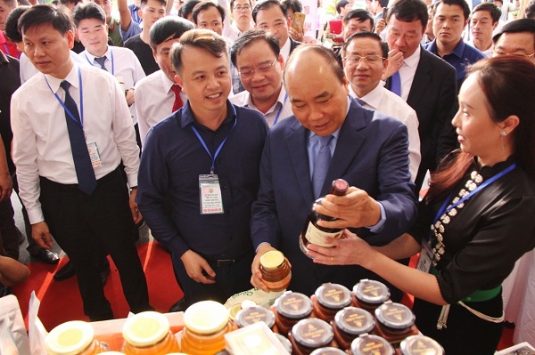 | Thủ tướng Chính phủ Nguyễn Xuân Phúc thăm gian hàng giới thiệu sản phẩm tại khu vực triển lãm. |