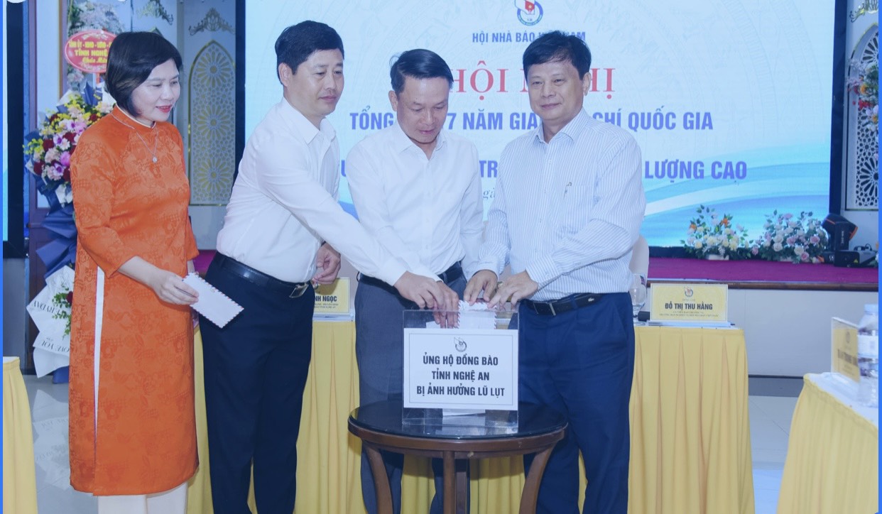 Lãnh đạo Hội nhà báo Việt Nam cùng các đại biểu, khách mời ủng hộ đồng bào Nghệ An bị ảnh hưởng bởi lũ lụt.