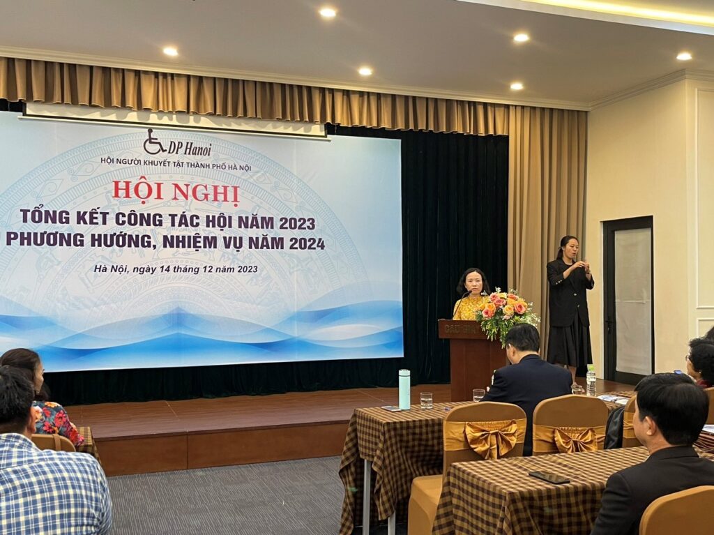 Bà Đoàn Thị Ngọc Lan, Phó Chủ tịch Thường trực Hội Người khuyết tật TP. Hà Nội, tiếp tục chương trình bằng báo cáo tổng kết hoạt động Hội trong năm 2023 và đề xuất các phương hướng, nhiệm vụ cho năm 2024. Bà Lan chia sẻ những thành công đáng tự hào, bao gồm việc nhận được bằng khen từ UBND TP. Hà Nội về công tác trợ giúp người khuyết tật, đóng góp vào đảm bảo an sinh xã hội trên địa bàn thành phố. Hơn nữa, Hội còn nhận giải thưởng từ Tổ chức Phục hồi chức năng Quốc tế (RI) vì những đóng góp tích cực trong phong trào người khuyết tật nhân kỷ niệm 100 năm thành lập RI.