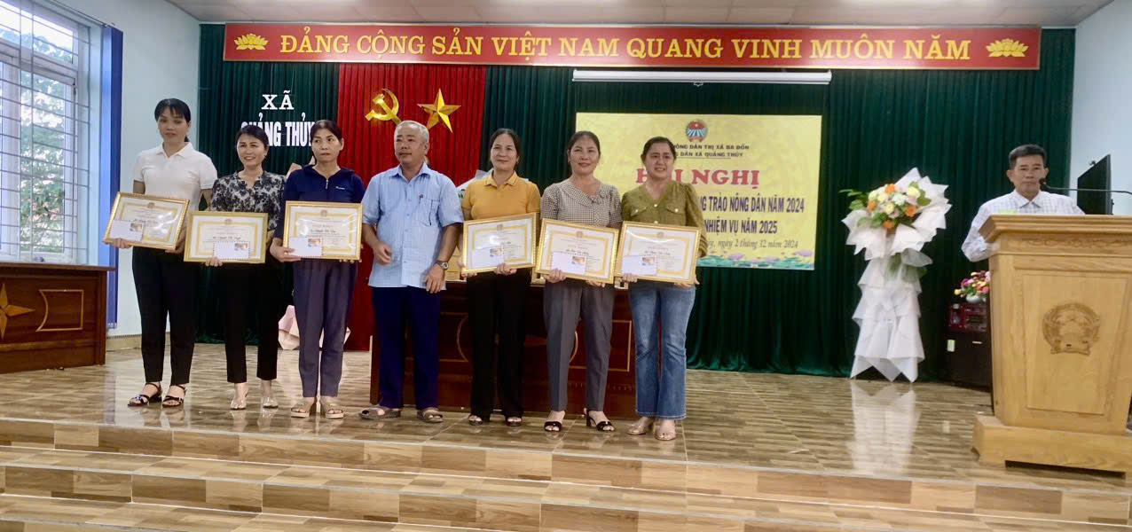 Công tác tuyên truyền, vận động cán bộ, hội viên được duy trì thường xuyên, tuyên truyền và vận động cán bộ, hội viên hưởng ứng xây dựng khu dân cư nông thôn mới kiểu mẫu; tham gia các hoạt động bảo vệ môi trường. Các cấp hội đã tập trung nâng cao chất lượng tổ chức hội vững mạnh; phát triển hội viên đi đôi với rà soát, nâng cao chất lượng hội viên và mở rộng đối tượng kết nạp hội viên; phát động cán bộ, hội viên tăng trưởng quỹ hội. Các phong trào thi đua lớn của hội tiếp tục duy trì nâng cao chất lượng và phát triển. Hiện nay, hội nông dân xã Quảng Thuỷ có 621 hội viên, trong năm kết nạp 8 hội viên, hội viên qua đời 4, chuyển sinh hoạt người cao tuổi 4 hội viên. Năm 2024, các cấp hội đang tín chấp, nhận ủy thác từ Ngân hàng Chính sách xã hội tạo điều kiện cho các hộ vay vốn và các hộ có nhu cầu vay vốn đầu tư sản xuất và tái sản xuất. Tổng dư nợ đến thời điểm hiện tại của Ngân hàng Chính sách xã hội thị xã là: 11.450.000.000đ; với 174 thành viên; của Ngân hàng Nông nghiệp và Phát triển Nông thôn Việt Nam: 10.200.000.000đ với 79 hộ vay. Quỹ hộ trợ nông dân của thị xã Ba Đồn: 320 triệu đồng cho 7 hộ gia đình hội viên vay để đầu tư chăn nuôi, sản xuất kinh doanh.