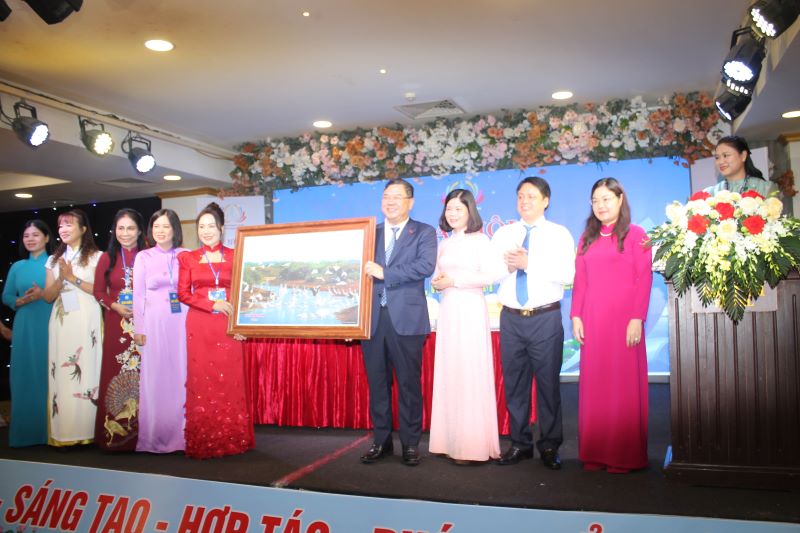 Ông Phạm Gia Túc, Ủy viên Trung ương Đảng, Bí thư Tỉnh ủy Nam Định tới dự, trao tặng Hội Nữ Doanh nhân tỉnh Nam Định bức tranh và lẵng hoa tươi thắm - Ảnh: Hồ Thanh