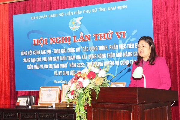 Ngày 23/12/2022, Hội Liên hiệp phụ nữ (LHPN) tỉnh Nam Định đã tổ chức trao giải cuộc thi “Các công trình, phần việc tiêu biểu, sáng tạo của phụ nữ Nam Định tham gia xây dựng nông thôn mới (NTM) nâng cao, kiểu mẫu và đô thị văn minh” năm 2022 gắn với tổng kết công tác Hội, triển khai nhiệm vụ và ký kết giao ước thi đua năm 2023.