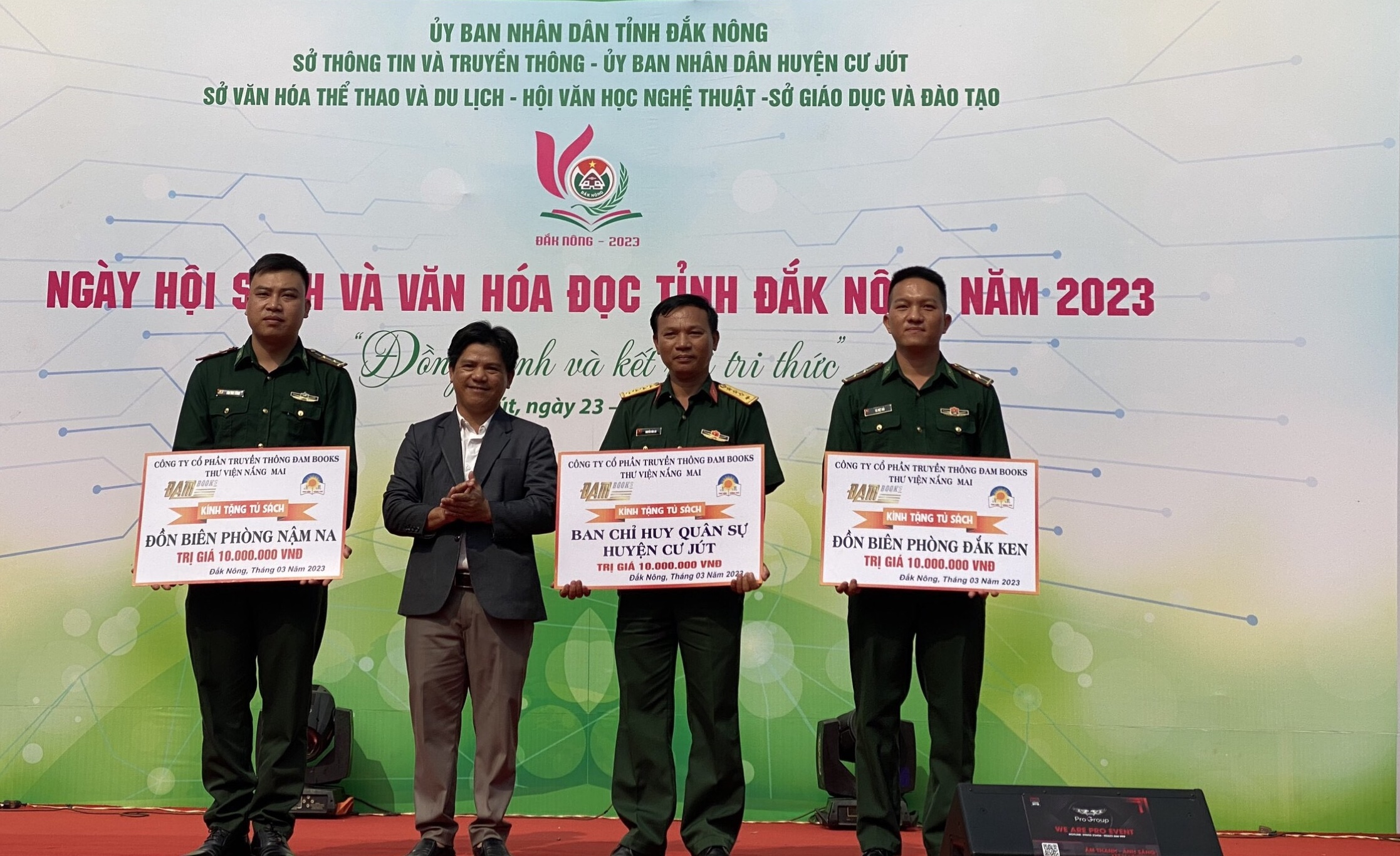 Ông Nguyễn Bá Nha, Chủ tịch HĐQT kiêm Tổng Giám đốc Công ty Cổ phần Truyền thông Đam Books, Chủ nhân Thư viện Nắng Mai ở tỉnh Phú Yên cho biết: Tuy ở xa nhưng với tinh thần chia sẻ văn hóa đọc, chúng tôi đã đóng góp, trao tặng 3 tủ sách cho 3 đơn vị lực lượng vũ trang nhân dân là: Đồn Biên phòng Đắk Ken, Đồn Biên phòng Nậm Na, Ban Chỉ huy Quân sự huyện Cư Jút. Đồng thời thi công sản xuất và tài trợ Ban Tổ chức biểu trưng tặng đại biểu phục vụ sự kiện hội sách.