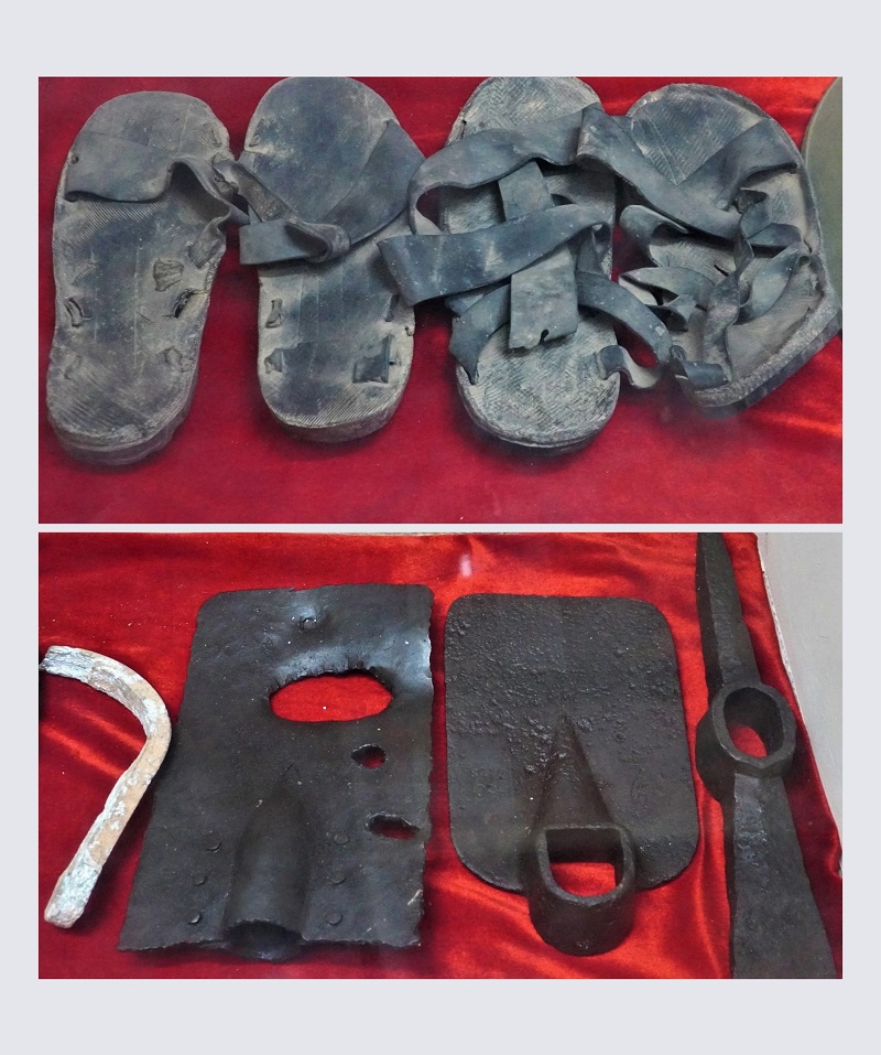 Một số kỉ vật: Dép cao su, cuốc xẻng được tìm thấy tại hố bom- nơi 10 nữ liệt sĩ thanh niên xung phong hy sinh. (Ảnh: Nguồn Dân Trí)