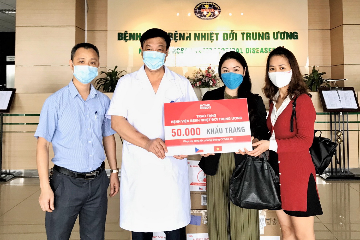 Tiến sĩ Phạm Ngọc Thạch - Giám đốc Bệnh viện Nhiệt đới Trung ương nhận khẩu trang trao tặng từ đại diện Công ty Home Credit Việt Nam.