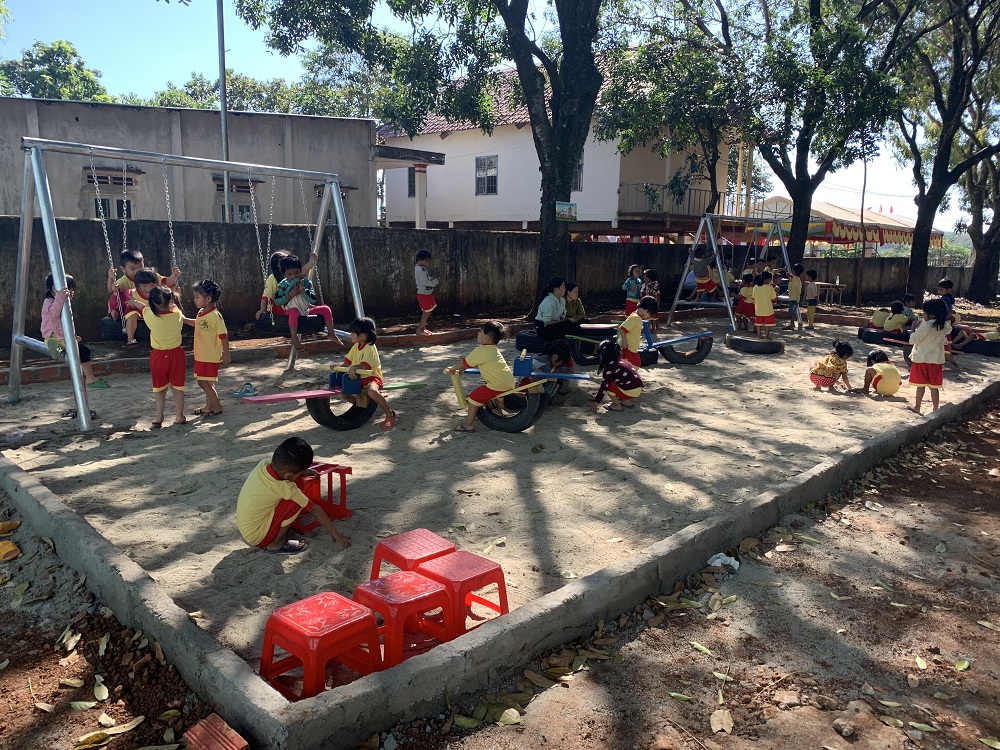 | Các Em học sinh háo hức với khu vui chơi vừa được xây mới và đi vào hoạt động. |