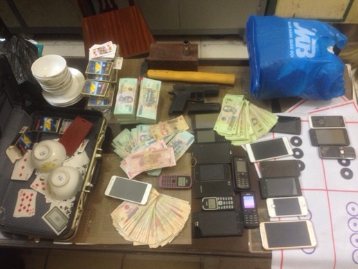 Tang vật thu giữ được ở trên chiếu bạc khoảng 330 triệu đồng tiền mặt, 39 ĐTDĐ, 2 ô tô, 14 xe máy, nhiều dụng cụ để sử dụng đánh bạc như: bảng vị, quân bài, bát đĩa…