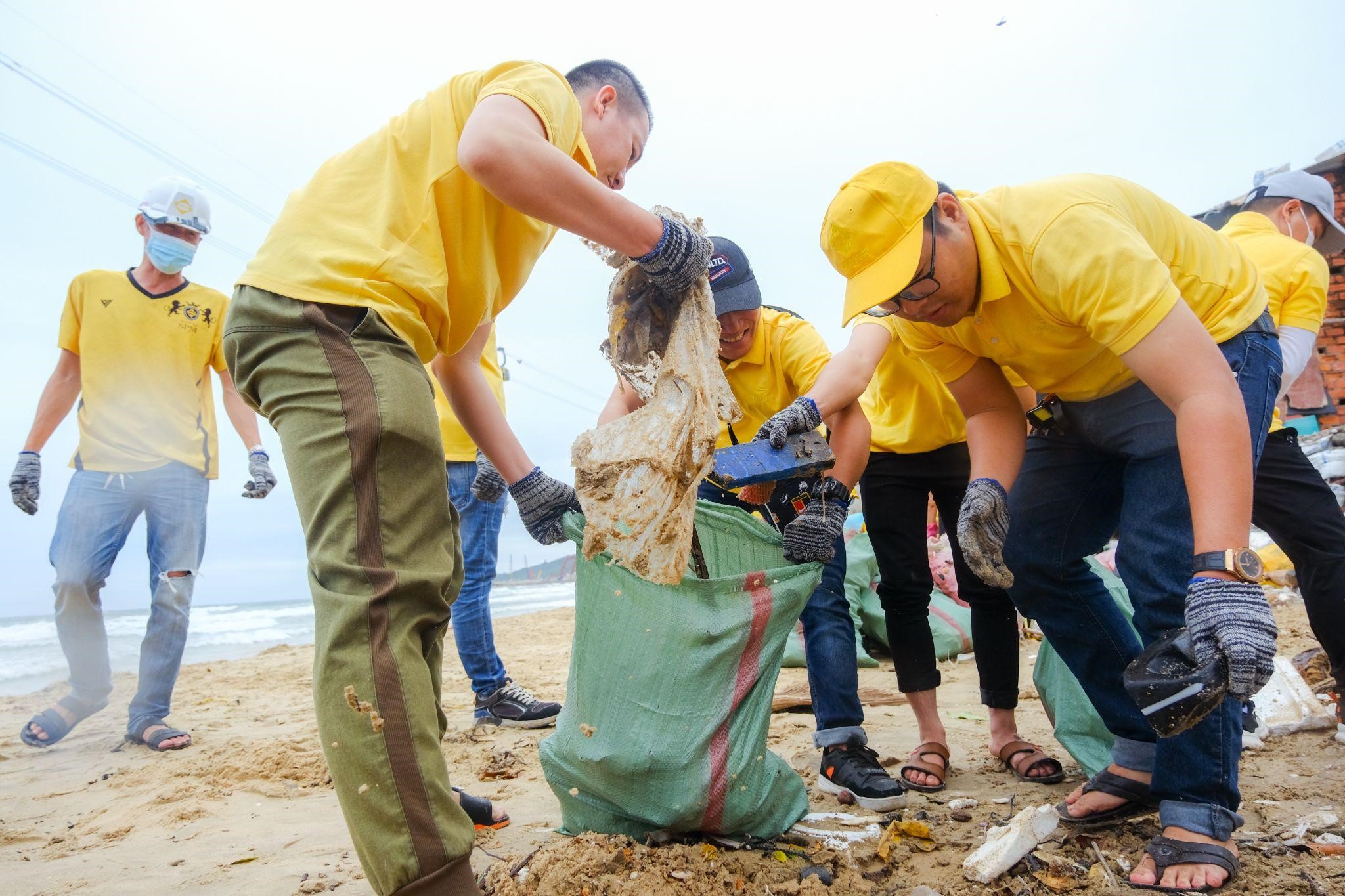 Dọc 1 km đường biển Bãi Xếp, hàng dài tình nguyện viên hết mình thu gom rác thải dạt vào bờ biển. Do Phú Quốc là nơi “cửa ngõ” đón gió mùa Tây Nam, nên vào mùa mưa, những bãi biển ở phía Nam đảo trở thành nơi tập kết rác bất đắc dĩ từ vùng biển Thái Lan.