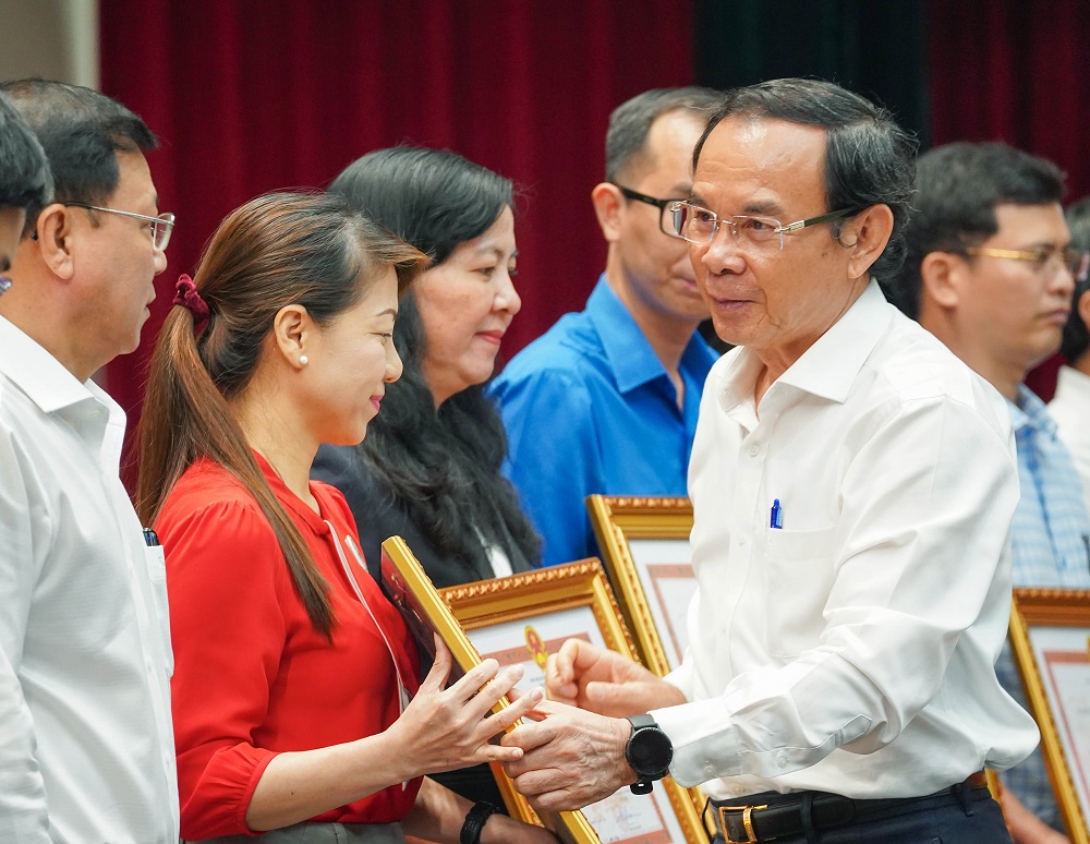 Chủ tịch UBND TP Hồ Chí Minh Phan Văn Mãi trao bằng khen đến các Chủ tịch phường, xã, thị trấn đã có thành tích xuất sắc năm 2023.